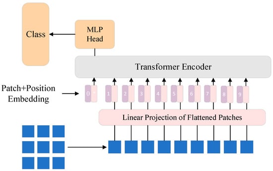 The Vision Transformer (ViT), proposed by Google Research in 2020 [20], is a Transformer-based model for image classification. The innovation of ViT lies in its departure from traditional Convolutional Neural Networks (CNNs). Instead, it treats an image as a sequence of patches and processes them as sequential data within the Transformer architecture. The core idea of the model is that spatial information in images can be captured through the self-attention mechanism, enabling efficient image classification. The structure of the model is illustrated in Figure 1.