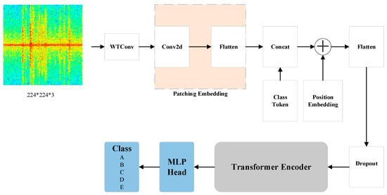 The model proposed in this paper improves on the traditional ViT by integrating the WTConv and SLAttention modules into the ViT architecture for ship radiation noise recognition. This enhancement allows the model to better extract effective features when processing input data with high spatiotemporal complexity, thereby improving the accuracy of image classification. The main structure of the model is shown in Figure 2. First, the audio signal is converted into a time–frequency spectrogram using the Short-Time Fourier Transform (STFT), which is then fed into the network. The basic calculation formula is as follows: