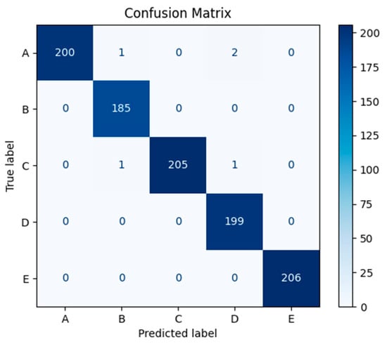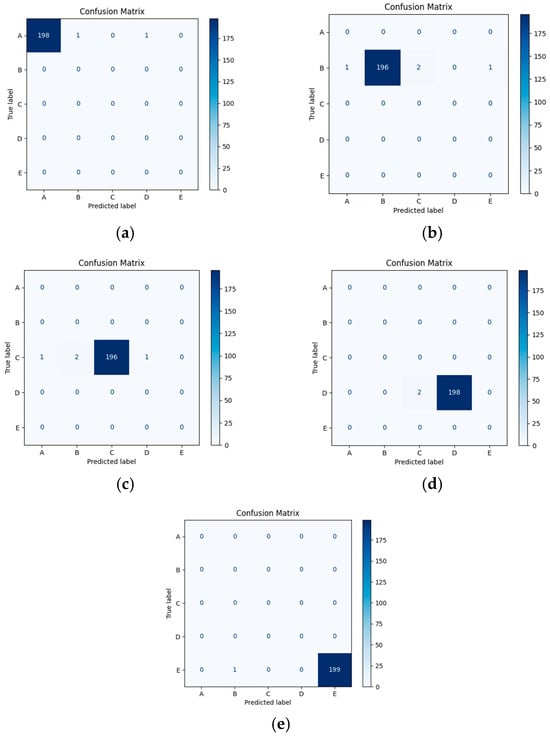 By using Test Set I, the confusion matrix of the experimental results in this paper is shown in Figure 3. Subfigures (a), (b), (c), (d), and (e) in Figure 3 represent the recognition performance of categories A, B, C, D, and E, respectively.