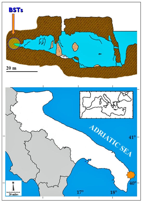 The investigated BST was sampled in the submarine cave “lu Lampiùne” (Figure 1), one of the most complex and largest submerged caves of the Salento coast (Cape of Otranto, Apulian Peninsula, SE Italy, 40.0052778° N–18.5072222° E).
