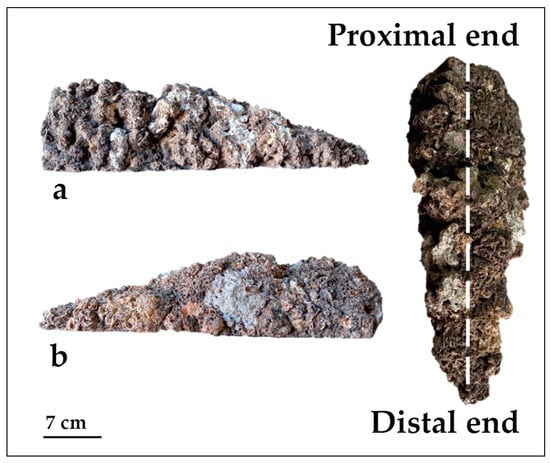 The BST collected from the “lu Lampiùne” cave oriented according to its vertical growth with the proximal part corresponding to the point of attachment to the ceiling. (a) Coarse side view of one of the two halves into which the BST was cut longitudinally, (b) Smooth side view of one of the two halves into which the BST was cut longitudinally.
