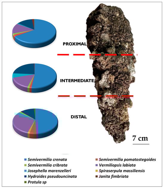 Semivermilia crenata was the most abundant and broadly distributed species on the whole BST, accounting for 57% of the total serpulid coverage, followed by Vermiliopsis labiata (20%) and Hydroides pseudouncinata (14%) (Figure 4). Semivermilia crenata and H. pseudouncinata were more abundant at the proximal position of the BST with 344 and 68 individuals, respectively, while the abundance of V. labiata was higher at the distal position where 138 individuals were identified (Table 1). The other two species, belonging to the genus Semivermilia, Semivermilia pomatostegoides and Semivermilia cribrata, showed lower abundances than S. crenata.