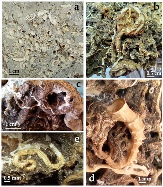 Serpulidae of the BST from the “lu Lampiùne” cave. (a) Detail of the BST transversal section of the investigated BST showing the core mainly constituting large Protula tubes; (b,c) aggregates of irregularly coiled Protula tubes colonized by other superimposed serpulids on outer BST surface; (d) Vermiliopsis labiata; (e) Semivermilia crenata.