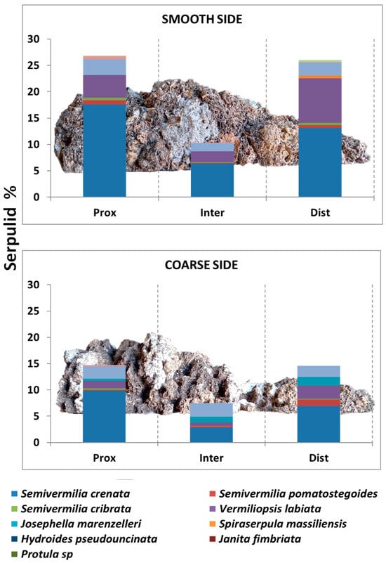 The coarse surface of the BST hosted 37% of the total Serpulidae; however, only 7% were positioned at the intermediate position. Although higher abundance values were found on the smooth surface, the number of individuals at the intermediate position was still lower on this side (10% of the total Serpulidae) compared to the proximal and distal ends.