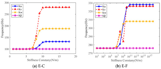 - The calculation method proposed in this article is applicable to any boundary condition and is not limited to the classical boundaries in the traditional literature. Through parametric analysis, we found that the arbitrary boundary stiffness of the combined shell is related to its own origin dynamic stiffness value. When the elastic stiffness in any direction at both ends of the combined shell is of the same magnitude as the dynamic stiffness in that direction, the influence of elastic boundary stiffness on the natural frequency of the double-layered cylindrical shell becomes more significant;