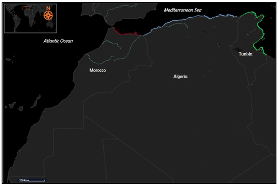 The Mediterranean coastline of Morocco, Algeria, and Tunisia (Figure 1, latitudinal range: 28° N–37° N; longitudinal range: 10° W–12° E) is a crucial area for studying the expansion of the jellyfish species Pelagia noctiluca; this species causes frequent bloom events in the region [1,5]. This zone encompasses various oceanographic environments, from the Alboran Sea to the Algerian Basin and the Gulf of Gabès. Each area has distinct hydrographic conditions influenced by mixing Atlantic and Mediterranean waters, seasonal upwelling, and mesoscale eddies [6,9,31]. The gradients in sea surface temperature (SST), which range from 16 °C to 28 °C on a seasonal scale, along with other abiotic factors like wind-driven currents and localized nutrient enrichment, particularly near river mouths like the Moulouya and Medjerda rivers, create a highly variable environment for P. noctiluca. These conditions help define the triggers for jellyfish blooms [32,33,34]. Along Morocco and Algeria, the Atlantic inflow through the Strait of Gibraltar impacts the western part of this region and controls the variability in surface salinity and mixing. Meanwhile, the eastern Tunisian coast experiences strong summer stratification and oligotrophic conditions, with occasional nutrient enrichment [16,35]. These environmental gradients, along with human pressures such as overfishing of jellyfish predators and coastal urbanization, provide an ideal setting to distinguish between natural and human-driven factors affecting jellyfish populations [21,36]. The Gulf of Gabès, with its shallow and often productive waters (less than 50 m deep), offers a “natural laboratory” for studying these dynamics. This area is susceptible to climate-related SST anomalies, making it a hotspot for P. noctiluca aggregations [12,37,38]; this region’s combination of temperature- and nutrient-variable coastal upwelling systems creates an excellent model for studying the complex relationships between hydroclimate variability, trophic cascades, and jellyfish outbreaks which is an issue in Mediterranean marine ecology [28,39,40,41].