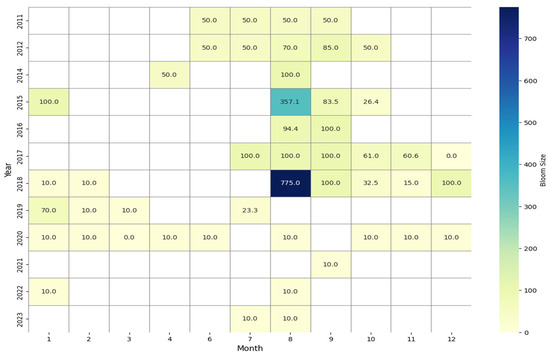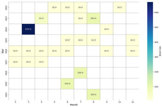 Yearly Consistency: The greatest bloom size was recorded by 2014 during March; the other specific years, such as 2013, 2020, 2022, and 2023, demonstrate comparatively large bloom volumes during the summer months, sustaining moderate intensity. On the other hand, the years 2012, 2015, 2016, and 2017 have significantly lower bloom counts; most months show values of 10, indicating fewer bloom events over that period.