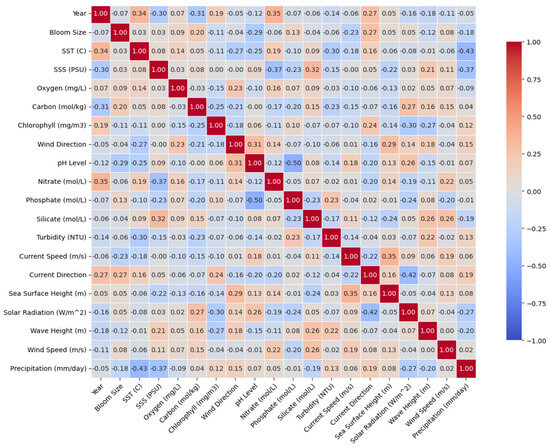 This approach helped to measure the degree and direction of interactions between bloom episodes and environmental factors [46,47]. Heatmaps then helped to clearly show these relationships, therefore clarifying the main environmental causes of jellyfish outbreaks. The heatmaps also visually represented the variables most strongly associated with P. noctiluca bloom occurrences.