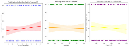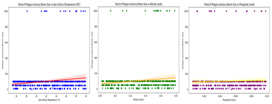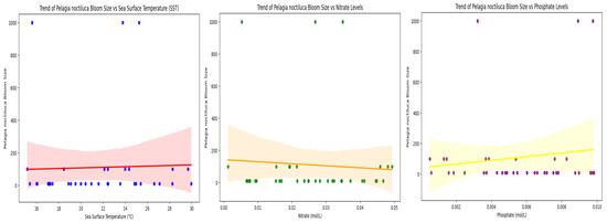 Overall, these trends indicate that bloom intensity does not exhibit a strong relationship with these environmental factors alone in this special research area of the Moroccan Mediterranean coastline [51]. At the same time, sea surface temperature shows a slightly stronger positive trend, and nutrient levels (nitrate and phosphate) exhibit only marginal effects. This suggests that while warmer waters may create more favorable conditions for Pelagia noctiluca blooms, other ecological and oceanographic factors—such as food availability, ocean currents, and interspecies interactions—may play a more significant role in determining bloom intensity. Consequently, future research must include supplementary variables, including zooplankton abundance and hydrodynamic circumstances, to enhance the comprehension of these bloom processes [53,70,71].