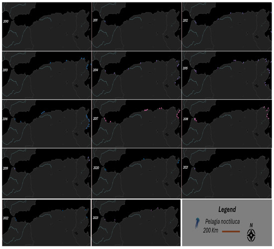 Potential Influences: The overarching tendency suggests that Pelagia noctiluca blooms are more frequent and stronger in the Spring-Summer months, although their magnitude and occurrence can fluctuate significantly from year to year. The years 2014, 1013, 2020, 2022, and 2023 are noted for their huge bloom intensity, while the years 2012, 2015, 2016, and 2017 have considerably lower bloom sizes. Overall, the results from Figure 3 reveal that Pelagia noctiluca blooms tend to peak during the warmer months, particularly in years like 2014, 2013, 2020, 2022, and 2023. However, the decline in bloom activity suggests that factors beyond just temperature and food availability, such as environmental and ecological shifts, could influence the frequency and intensity of jellyfish blooms along the Algerian coast [53,54].