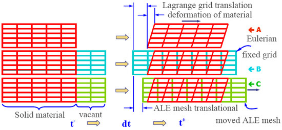 The velocity of the material is determined based on the structural dynamics of the shell. Here, represent the element mass, damping modulus, and elastic modulus, respectively. is the resultant force applied on the shell element. It is worth mentioning that the difference between the descriptions given by the ALE, pull, and European methods is that ALE can describe the material domain boundary as accurately as the Laplace grid, while the material domain information (such as the velocity of the material, stress, etc.) is kept in the reference grid (Euclidean description). When the material domain is seriously deformed, the mesh describing it can be updated to maintain good mesh quality, while the information of the material domain given in the reference grid is updated by means of convection. The three categories of difference are illustrated in Figure 1.