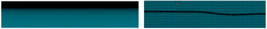 For the fluid domain, we discretize the fluid domain with a hexahedral grid, which is gradually more encrypted as we move closer to the submarine (center point). The density and viscosity coefficient of seawater in a given fluid domain is given. The partial stress is not considered in the state equation, and the initial internal energy, initial relative volume, and parameters C4 and C5 in the fitting equation are defined. The section parameter of the fluid domain is the single point multi-matter ALE unit, which is the most accurate and comprehensive when dealing with the ALE problem. For hexahedral solid units, the hourglass model uses the standard LS-DYNA viscosity type with an hourglass coefficient of 1 × 10−9.