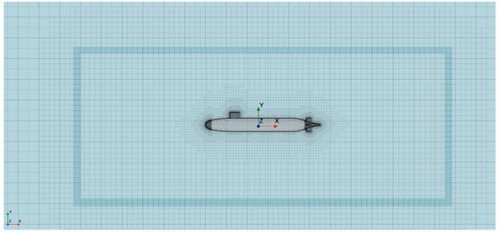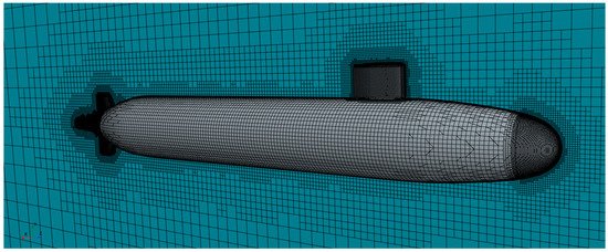 The above geometric model establishes a grid model (Figure 5), and the suboff model and peripheral grid are 440,000. At the same time, the hull is scaled to equal proportions, such that the total displacement of the hull is about 3000 t. The initial grid model following the overall assembly is shown in Figure 6. It is worth mentioning that the “fluid-structure coupling” here is actually a generalized representation, and the solid domain can use a six-degree-of-freedom rigid body model (considering attitude changes) or a finite element model (considering attitude changes and deformation) and the seawater has little impact on the body, and the calculation amount caused by the above two models has little impact. In order to describe the geometry of the submarine, the finite element mesh is used to describe the submarine shape, but the attitude change is calculated by using a six-degree-of-freedom model in the solid domain; that is, the solid domain element is assigned as a rigid body.