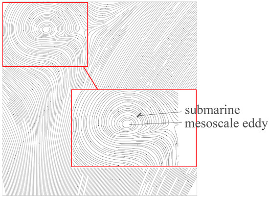 In different life cycles, the mesoscale vortex usually has a relatively stable maximum velocity zone, and the velocity decreases with the increase in the radius outside the maximum velocity zone. In the inner part of the maximum velocity zone, the velocity decreases as the radius decreases. It is assumed that the mesoscale vortex is a two-dimensional flow field that changes only in the horizontal direction and is evenly distributed in the vertical direction; that is, in the vertical direction, the flow field distribution of each layer is the same as that of the ocean surface. The submarine moves horizontally through the eddy current (Figure 7), and its acceleration, speed, attitude, and shape will change under the influence of the eddy current.