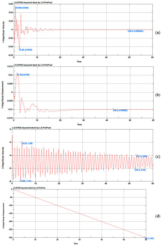 Firstly, the eddy current effect is analyzed for the case of type 1. In this case, the submarine essentially does not float up or dive down in the vertical y direction (Figure 8a,b) but only advances at a speed of 5 m/s (x direction) and is affected by type eddy currents (z-direction). Therefore, its forward speed fluctuates slightly around about 5 m/s (Figure 8c), while its displacement increases steadily (Figure 8d). After 60 s, it advances by 300 m. The speed in the forward direction of the submarine is about 5 ± 1 m/s. At the same time, the oscillating change in the directional velocity causes the integral results to cancel each other out; that is, the displacement is not affected by the eddy current and remains the same as it would be in the absence of an eddy current.