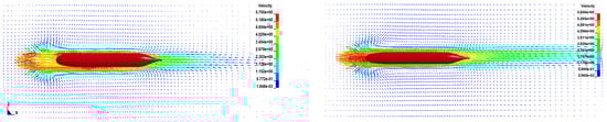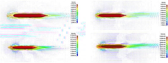 First, we should consider Figure 10, which shows the vector distribution of the flow field around the submarine under the type 1 condition (20 s and 50 s, respectively). It can be clearly observed from the figure that under the type 1 condition, although the velocity of the submarine and the distribution form of the flow field around it fluctuate with the passage of time, they show high similarity between different moments. This similarity indicates that although there is an interaction between the vortex and the submarine, the distribution of the surrounding flow field is not greatly changed by this interaction. In other words, under this condition, the existence of eddy currents does not fundamentally change the overall layout and characteristics of the flow field around the submarine. Similarly, the velocity vector distribution of the submarine flow field under type 2 and type 3 conditions (Figure 11) is analyzed (20 s and 50 s).