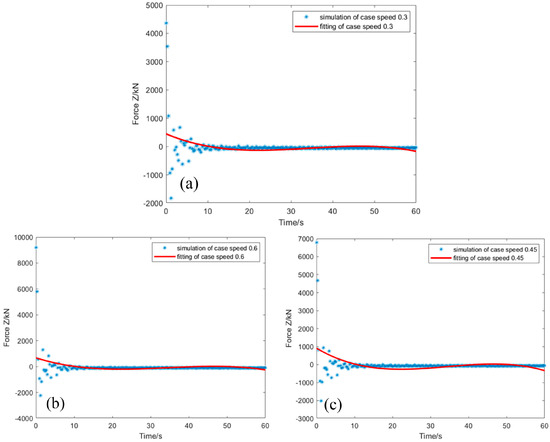 Figure 12 shows the lateral force fitting of the submarine under different working conditions, from which it can be inferred that the influence of the mesoscale vortex on the force of the submarine is not very obvious (in Figure 12, the force oscillation of 0 s is slightly larger because the explicit method used is fundamentally different from the implicit algorithm adopted above; if the implicit algorithm is adopted, the forces at the beginning and end times will be predicted to be the same). The fitting expression is , and the parameters are shown in Table 3.