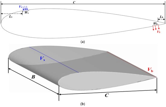 Currently, the majority of research on combined blowing/suction jets is concentrated on enhancing the aerodynamic efficiency of foils. Aziz [] implemented consistent suction by creating an aperture in the head of the wind turbine blade. The findings indicated that implementing suction techniques might substantially enhance the pressure differential on the wind turbine blade’s surface, thereby augmenting its lift coefficient and energy capture efficiency. Qiang [] conducted numerical simulations on an OA213 (Office National Recherché Aerospatiale’s 213) airfoil utilizing combined jet technology for blowing and suction. The calculation findings indicate that the best active control efficacy is attained when the blowing/suction combined jet arrangement points align with the flow separation points of the OA213 airfoil. Müller [] investigated the impact of a blowing/suction mixed jet device on the aerodynamic performance of the NACA0018 airfoil in a low-speed wind tunnel. The experimental findings indicate that for medium Reynolds numbers (1.5 × 105 to 5.0 × 105), the lift coefficient can be enhanced by over 25% with the implementation of combined blowing and suction jet active control strategies. Wahidi [] examined the LA2573 (Liebeck Airfoil 2573) airfoil, investigating the impact of an active control strategy utilizing blowing/suction combination jets on the reduction of the airfoil’s resistance characteristics at short angles of attack (0°~6°) in a wind tunnel. The experimental findings indicate that the suction mechanism can significantly postpone flow separation on the airfoil surface, resulting in a resistance reduction of 14% to 24%. Sun et al. [] focused on the NACA0021 airfoil and determined the optimal parameters for the suction/blowing combined jet scheme, including the ideal suction/blowing position and flow rates, by employing the three-factor orthogonal design methodology.