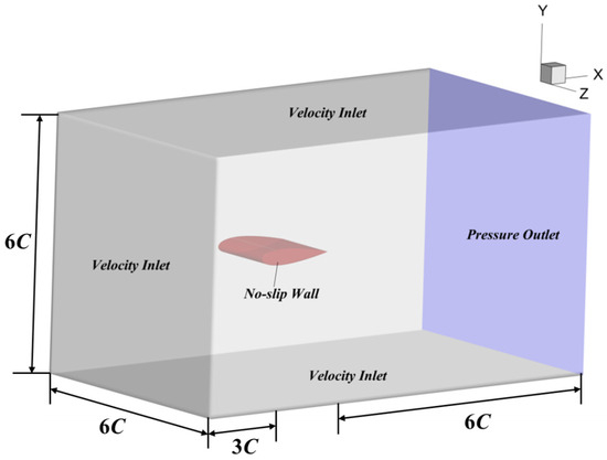 This paper utilized a cuboid-shaped computation domain, as illustrated in Figure 2, with the following principal dimensions: (length, width, height) = (10 C, 7 C, 6 C). Concerning the boundary conditions, the right border of the calculation domain is designated as the pressure outlet condition, while the remaining five surfaces are established as velocity inlet conditions, with an incoming flow velocity of 1.028 m/s. The corresponding Reynolds number is 1.0 × 106. The hydrofoil is designated as a non-slip wall condition. As for the BSCJ foil, the velocity inlet boundary condition is imposed on the blow and suction surface, and the direction is perpendicular to the surface (seen in Figure 1a).