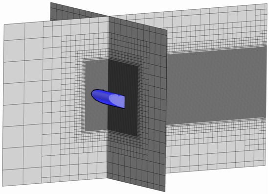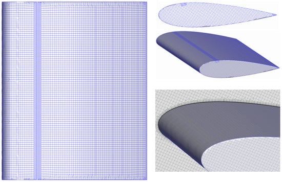 The hexahedron-shaped grid was utilized in the grid design to enhance calculation accuracy by using of commercial software STAR-CCM+ 12.06. The local grid refinement technique was employed to capture the flow structure. The height of the initial layer adjacent to the foil met the criterion of y+ = yuτ/ν ≈ 1 [], where uτ denotes the wall shear stress and y indicates the distance from the first layer to the foil’s surface. Figure 3 and Figure 4 depict the grids of the hydrofoil surface and the representative sections of the computational domain, respectively.