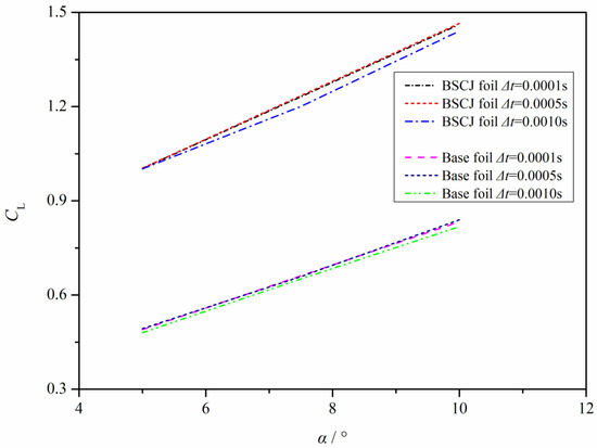 When it comes to time step selection, three various values of time step were selected and they are , respectively. The value of CL under various magnitude of are plotted in Figure 6, where the corresponding attack angle varies from 5° to 10° and the fourth set of gird (G4) is chosen. As can be seen in Figure 6, when the value of time step alters from to , the relevant difference in magnitude of CL is somewhat minute. Specifically, the biggest difference is less than 0.18%. However, when the value of climbs to , the relevant difference keeps increasing with the increase of attack angle. In particular, the peak value of difference in CL between the and is 0.89% (corresponds to the condition of base foil) and 2.12% (corresponds to the condition of foil_BSCJ), respectively. Therefore, the value of time step will be set as in the following calculation.