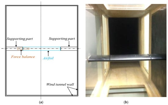 Concerning the accuracy verification work, we take the model test results carried out by our research group as a reference. The test model is consistent with the calculation model, and the test is carried out in a small wind tunnel (Seen in Figure 7). The test wind speed was 30 m/s, the velocity attack angles were set at 0°, 3.67°, 6.15°, 9.19°, 11.21°, 12.22°, 13.22°, and 14.27°, respectively, and the characteristic Reynolds number was 4.12 × 105. The comparison results of the lift coefficient are shown in Figure 8. The relevant data processing software is Origin 8.5. It is noted that the data acquired from the experiment have been modified by using binary boundary correction and the effect of the supporting part has been eliminated. Considering that the flow is turbulent, the repeatability test results are also given in Figure 8.