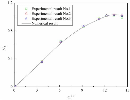 Figure 8 demonstrates that the computational conclusions presented in this work align closely with the experimental findings. In addition, the repeatability of three sets of experimental data is good, with a maximum deviation of 1.6%. The most significant discrepancy between the calculated values and the experimental data is 1.85%. Furthermore, the stall phenomena transpires when the angle of attack exceeds 12°, and the stall point aligns well, meaning that the accuracy of the current numerical method is suitable for the following calculation.