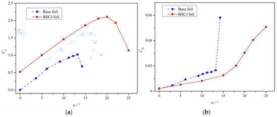 Figure 9 illustrates that when the BSCJ device is affixed to the conventional foil, the corresponding value of CL exhibits a significant rise at all attack angles, with the maximum value attained at α = 21°. In comparison to the conventional foil, the use of BSCJ not only increases the value of CL but also postpones the stalling point. The stall phenomena for the base foil occurs at an angle of 12°. However, when the BSCJ is affixed to the foil, the stalling point can stretch to 21°. Conversely, regarding the CD, there is a negligible difference in the value of CD between the standard foil and BSCJ foil when the attack angle is within a narrow range (α < 4°). As the attack angle increases, the corresponding value of CD in the BSCJ foil diminishes relative to that of the traditional foil, indicating that the implementation of the BSCJ device contributes to a reduction in drag force.