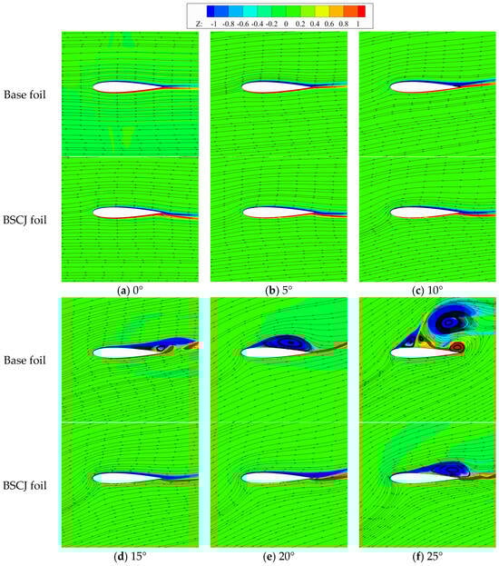 Figure 10 illustrates that, for the base foil, flow separation does not manifest on the foil surface at α = 0°and the streamline remains predominantly attached to the foil. The BSCJ foil exhibits minimal suction on the upper surface; however, the pronounced shear flow induced by blowing on the lower surface results in a blocking effect at the hydrofoil’s trailing edge. This phenomenon is similar to the implementation of a virtual Gurney plate at the tail, thereby augmenting the effective curvature of the foil. Consequently, a substantial lift force can be generated even at α = 0° (as evidenced by the results in Figure 9a). As the attack angle increases further (α = 10°), vortex and streamline separation transpire at the trailing edge of the base foil. In contrast, the BSCJ foil effectively eliminates low-momentum fluid from the upper surface due to the suction device, thereby enhancing its capacity to withstand the adverse pressure gradient. Consequently, there is no occurrence of flow separation at this angle of attack. Moreover, as the attack angle (α = 10°~20°) increases, a significant region of flow separation develops on the base foil’s surface, with the flow separation point progressively advancing. The associated value of CL diminishes markedly, resulting in the occurrence of stalling. Regarding the BSCJ foil, Figure 10d,e illustrate that the mutual interplay of suction and blowing jets causes the stagnation point at the leading edge of the foil surface to shift rearward, significantly improving the circulation of the foil. Enhancing circulation will augment the capacity to withstand unfavorable pressure gradients and elevate lift force. At an angle of attack of α = 25°, the vortex structure on the surface of the base foil periodically detaches, resulting in a significant flow separation zone. The flow separation phenomenon also manifests at the tail of the BSCJ foil, resulting in the occurrence of stalling at this juncture. Nonetheless, in comparison to the base foil, the flow separation zone is relatively diminutive. The presence of a suction/blowing jet primarily improves fluid attachment capability and the curvature of the nearby streamline.
