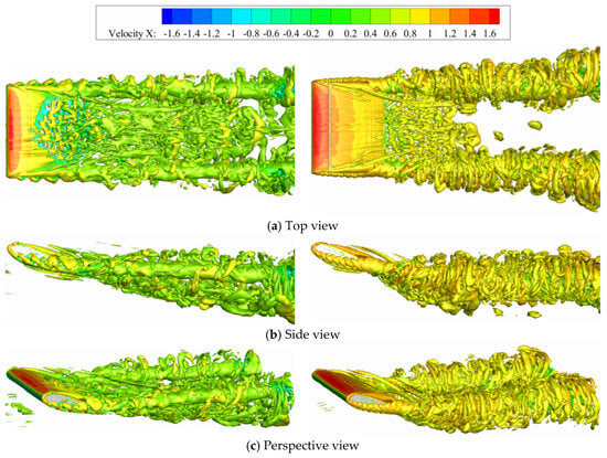 To more intuitively illustrate the internal process of the BSCJ foil in preventing flow separation, Figure 11 illustrates the vortex field configuration of the base foil and the BSCJ foil at α = 25°. The λ2 criterion was employed to define the vortex structure, with the pertinent value established at λ2 = −0.5. The flow velocity was utilized for staining purposes. Figure 11 illustrates that for the initial foil, vortex formations of varying scales in the fluid domain surrounding the foil dissipate sequentially. Currently, the tip vortices and the separated vortices on the surface are intermingled, resulting in a significantly low fluid velocity at the foil surface. In the case of the BSCJ foil, the suction/blowing jet action results in flow separation occurring only on a limited portion of the foil surface, with the associated fluid velocity significantly exceeding that of the base foil.