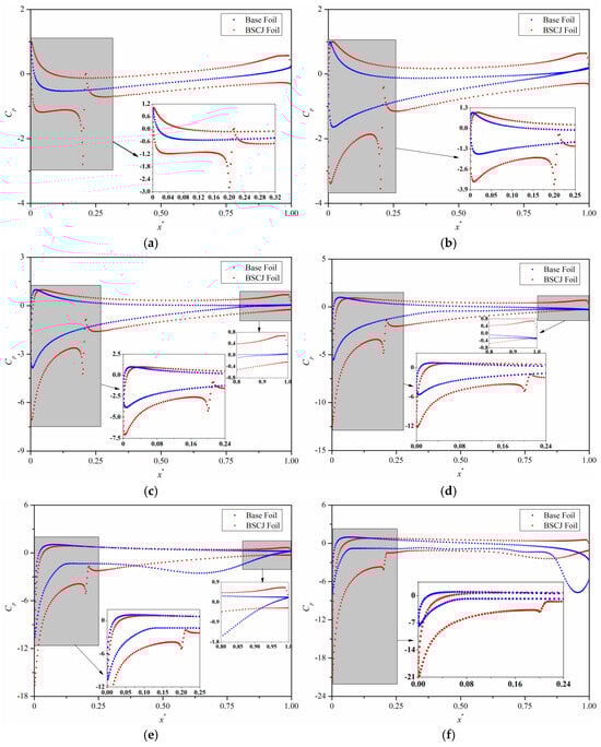When α = 0°, it is evident from Figure 12a that the pressure coefficients on the top and lower surfaces of the base foil are identical, resulting in a lift coefficient of zero. The presence of the jet at the leading edge of the BSCJ foil results in significant negative pressure on the lower surface of the hydrofoil, hence amplifying the pressure coefficient differential and enabling the generation of a substantial positive lift. This conclusion aligns with Figure 9a. As the angle of attack continues to rise, a boundary layer on the pressure surface, induced by the head jet, re-emerges. This results in an expansion of the negative pressure region on the pressure surface, thereby augmenting the pressure differential between the upper and lower surfaces, which in turn elevates the lift coefficient of the hydrofoil. Furthermore, in conjunction with Figure 12, it is evident that the presence of the blowing jet at the tail of the BSCJ hydrofoil causes the trailing edge of the foil to deflect towards the pressure surface, hence augmenting the camber of the hydrofoil, which enhances lift performance.