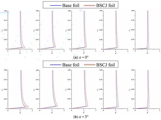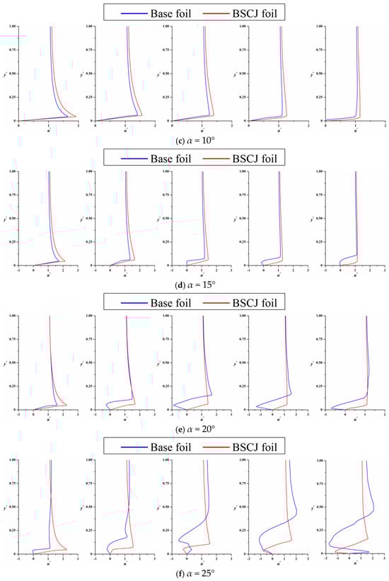 Given that the formation of the boundary layer significantly influences the hydrodynamic performance of the hydrofoil, Figure 13 illustrates the normal velocity distribution curve at the mid-span portion of the hydrofoil at various angles of attack. The relative locations from left to right are x/C = 0.1, x/C = 0.3, x/C = 0.5, x/C = 0.7, and x/C = 0.19, respectively. u* and y* represent dimensionless velocity and normal height, respectively. It is defined as u* = u/V∞, y* = y/C, where u represents the local velocity and y denotes the perpendicular height from the grid point to the hydrofoil surface. The blue line denotes the base foil, whereas the red line signifies the BSCJ foil.