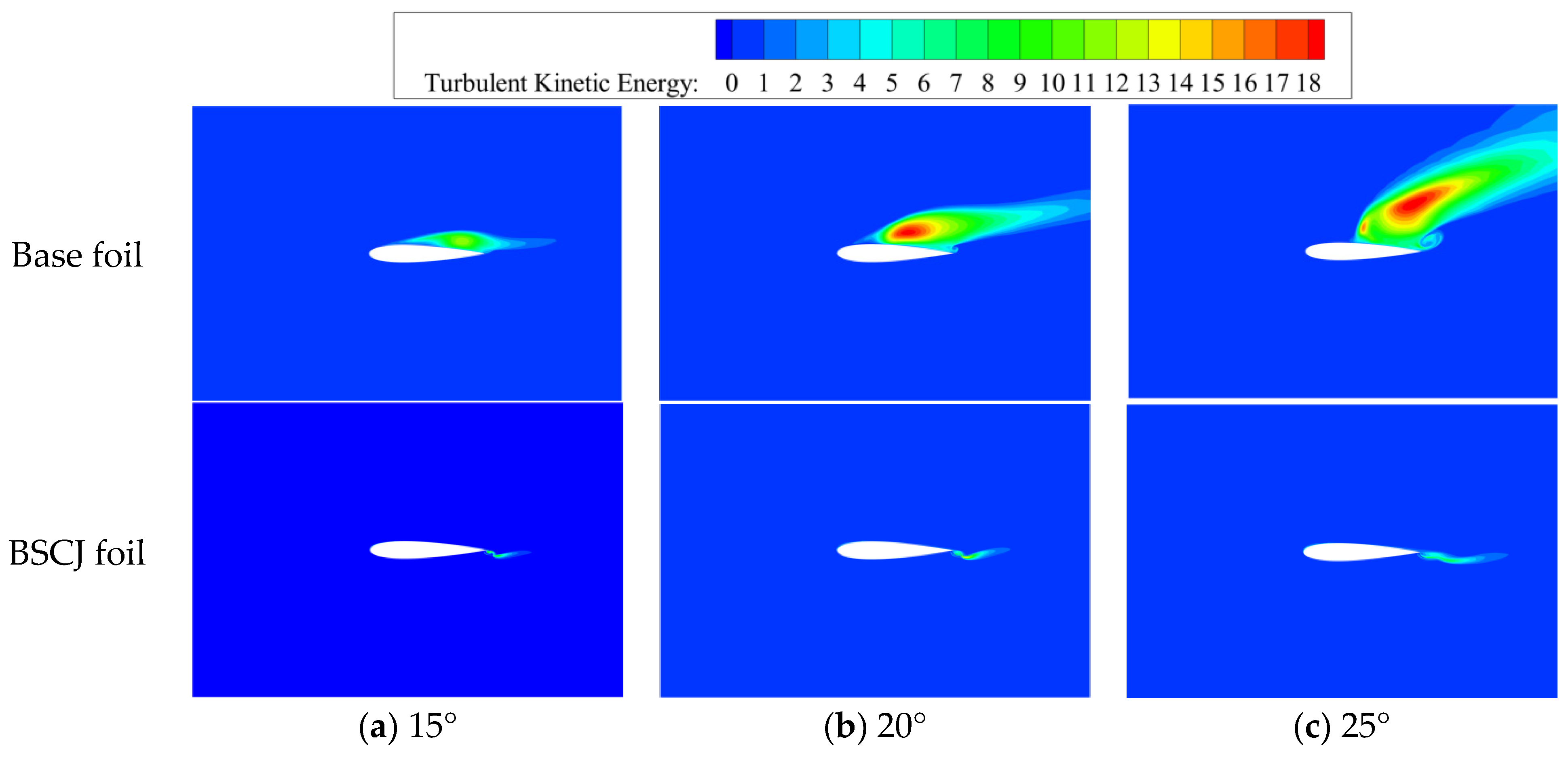 In order to further elaborate why the BSCJ can improve the fluid dynamics of the foil, the distribution of turbulent kinetic energy around the foil with/without BSCJ are presented in Figure 14. Three large attack angles were selected and they are 15°, 20° and 25° respectively. As seen in Figure 14, with the increase of attack angle, the intensity of turbulent kinetic energy exhibits a sharp growth, resulting in huge energy consumption. Severe flow separation also took place in the corresponding area and that phenomenon is in good consistency with Figure 10. However, when the BSCJ is introduced, the corresponding intensity of turbulent kinematic energy is significantly reduced and there exists little flow separation. Therefore, one conclusion can be drawn that the introduction of BSCJ can effectively cut down the intensity of turbulent kinetic energy and it can also rectify the flow, reducing the flow separation.