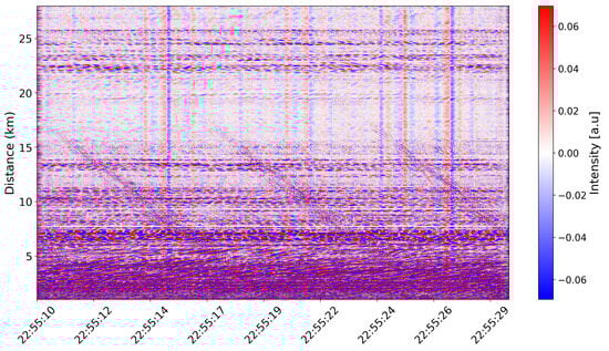 In Figure 2a, a reduction in the signal amplitude can be observed between 16 and 21 km from shore. This pattern also appears during background noise recordings, mainly at low frequencies, as represented in Figure 3, suggesting that it is not caused by the seismic event itself but is likely related to the cable or its environment. For example, variations in the cable’s coupling to the seabed, such as suspension, burial or poor mechanical contact, could result in distorted sensitivity in this segment [20,37]. Additionally, intrinsic optical losses in the cable, such as attenuation due to microbending or stress, or environmental factors like localized changes in sediment composition or seabed structure, may play a role. This variation in the signal amplitude emphasizes the importance of taking the cable’s condition and the local environment into account when interpreting DAS data. It also indicates the necessity for further research to better understand and optimize the system’s performance.