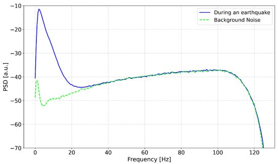 Comparison of PSD during an earthquake and the ambient noise. The result was obtained using 40 s of DAS data and averaged over a 10 km cable section between 5 km and 15 km.