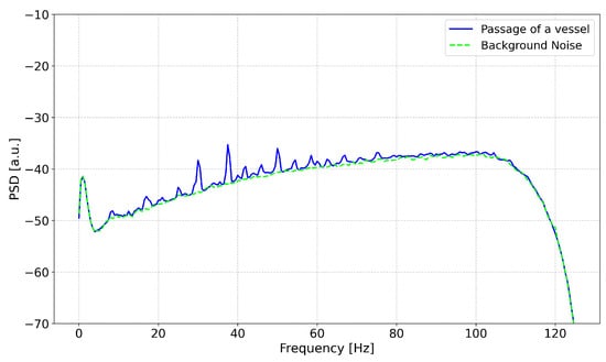 Figure 5 represents a PSD comparison of the passage of a vessel close to the cable and the common background noise. The PSD associated with the vessel’s noise shows multiple pronounced peaks between 10 and 80 Hz, as depicted also in the spectrogram in Figure 7b, a common signature of shipping noise. These peaks likely correspond to the propeller blade rate and harmonics generated by vessel engines and mechanical systems. The most significant peaks occur in the lower–frequency range (30–60 Hz), where noise levels increased to up to 5 dB above the background noise, which is typical for the low–frequency noise produced by large vessels [16]. In addition, an increase in the noise level can be observed in Figure 7b, mainly in the frequency range of 70–110 Hz. This behavior could be explained by the noise generated by the formation, growth and collapse of vapor bubbles in a liquid due to rapid changes in pressure, which is known in the literature as cavitation noise [39,40].