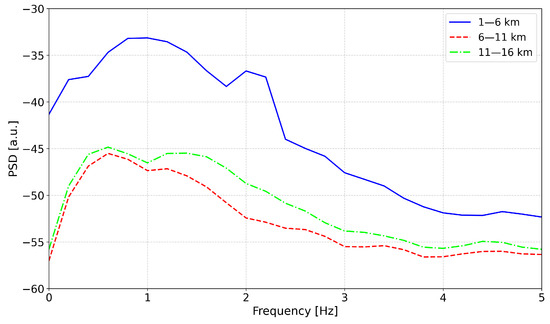 Figure 4 shows a Power Spectral Density (PSD) comparison between an earthquake event and the common background noise, revealing a broader spectral energy distribution, particularly concentrated in the low–frequency range below 20 Hz. The earthquake–induced PSD exhibits an increase to up to about 30 dB above background noise levels, with energy spikes notably present between 1 and 15 Hz. This pronounced low–frequency component is a defining characteristic of seismic activity, distinguishing it from anthropogenic noise sources such as vessel traffic, which typically exhibit harmonic peaks at higher frequencies, as shown in Figure 5. The energy gradually declines beyond 20 Hz and aligns with background noise above 30 Hz. Furthermore, in the PSD of the background noise, a small peak appears at frequencies below 3 Hz. This increase in energy comes mainly from teleseismic events, microseisms and ocean waves. In Figure 6, we present a PSD comparison along different cable sections. This plot shows a noticeable increase in energy levels in the shallow–water section (1–6 km) compared to the deeper sections. This increase in low–frequency energy is always present in the first 5 km section of the optical fiber, as shown in Figure 3. This increase in signal amplitude is mainly due to the surface gravity waves. In the deeper sections, the energy levels are lower because gravity–wave–induced seabed motion decays with depth. As the water depth increases, the seabed is less affected by surface gravity waves, leading to reduced low–frequency noise [38].