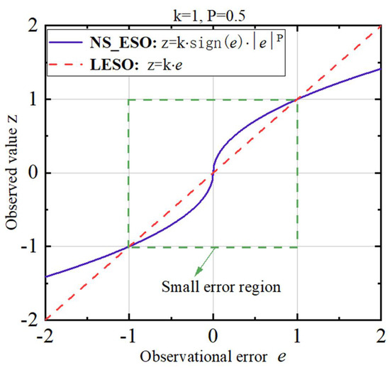 where is the nonlinear factor of the fal(.) function, and is the filtering factor. The NSEF can be viewed as a gain-scheduling method with adaptive variation according to the error. When , the equivalent gain is adjusted according to the rule ‘large error, small gain; small error, large gain’. When , the equivalent gain is adjusted according to the rule ’large error, large gain; small error, small gain’.