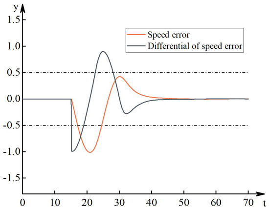 Taking the sudden load increase in a gas turbine as an example, the speed response curve is shown in Figure 2. From Figure 2, it can be seen that the speed error reflects the current deviation of the gas turbine speed from the steady-state, and the error rate reflects the future direction of the speed change. Simply using the speed error or the rate of change of the error cannot accurately capture the dynamic characteristics of the speed response during the transient state. As mentioned earlier, fuzzy logic control adjusts the output value based on both the error and the rate of change of the error. Therefore, using fuzzy logic control to design the NSEF can more accurately reflect the dynamic process of the gas turbine speed response and allow for reasonable adjustments to the controller gain parameters based on the different stages of the dynamic process.