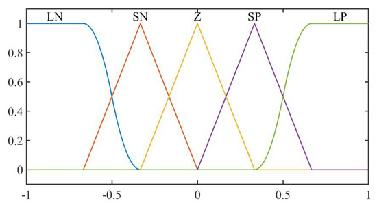 In the design process of the fuzzy membership functions, it is important to select an appropriate number of fuzzy subsets. If the number is too large, it will increase the computation time of the algorithm, while if the number is too small, the precision of the controller will be reduced. To simplify the structure of the controller, this paper selects commonly used membership functions. As shown in Figure 4, the fuzzy inference system’s input and output parameters are both represented by 5 fuzzy subsets, which are the Large Negative (LN), Small Negative (SN), Zero (Z), Small Positive (SP), and Large Positive (LP).