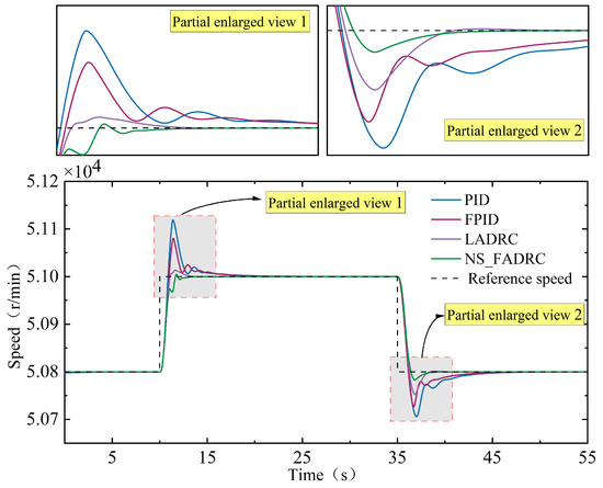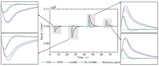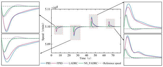 Figure 8 presents the speed step response results for the four controllers, with each controller’s response shown in different colored curves. The results indicate that, whether during the speed step-up acceleration or step-down deceleration process, all four control algorithms can effectively track the speed setpoint signal. Among them, the traditional PID control algorithm exhibits the largest overshoot and the longest settling time, while the NS_FADRC control algorithm demonstrates the smallest overshoot and no significant speed fluctuations. The dynamic performance indicators of the step response for all four control algorithms are detailed in Table 4.