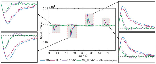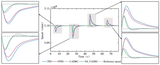 The gas turbine speed response results are shown in Figure 14. It can be observed that after the operating conditions change, the NS_FADRC algorithm achieves the smallest speed deviation and the shortest time to stabilize the speed at the rated value. In comparison, the speed deviation of the LADRC algorithm is similar to that of NS_FADRC, but it exhibits overshoot during the speed recovery phase, resulting in a longer stabilization time. The FPID control algorithm adjusts the parameters of the control algorithm using fuzzy logic, and its speed deviation and stabilization time are smaller than those of the PID control algorithm in all test conditions. Both LADRC and NS_FADRC utilize observers to estimate disturbances, significantly improving the disturbance rejection capability of the control algorithm, and their control performance in all four load disturbance conditions is far superior to that of the FPID and PID control algorithms.