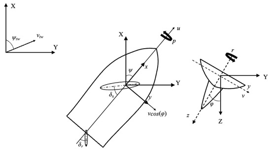 where u (m/s), v (m/s), p (rad/s) and r (rad/s) represent the forward, lateral, roll angular, and roll angular speed in the body coordinate system, respectively, and m represents the total mass. and (kg) represent the additional masses brought by u and v. and (kg/m2) represent the moments of inertia around the x-axis and z-axis, respectively, and (kg) represent the additional moments of inertia around the x-axis and z-axis, respectively, these parameters are all fixed parameters. and (i = s, r, h, k) (N) represent the forces in the x-direction and y-direction acting on the sail, rudder, hull and keel, respectively. and (N) represent the wave forces in the x-direction and y-direction, respectively. and (i = s, r, h, k) (N·m) represent the moments around the x-axis and z-axis, respectively. and (N·m) represent the wave forces and moments about the x-axis and z-axis, respectively. These parameters are variable and change with the state of the sailboat and the environmental conditions. Parameters a, b, c, and d are constants that are determined through the tilting tests. All of the above parameters are in the body coordinate system. The schematic diagram of the coordinate system is shown in Figure 1, where XYZ is the inertial frame, the positive X axis points north, the positive Y axis points east, and the positive Z axis is perpendicular to the XY plane, pointing toward the Earth’s center. xyz is the body coordinate system, the positive x direction points to the bow, the positive y direction points to starboard (from stern to bow), and the positive z direction is perpendicular to the xy plane, pointing toward the ship’s bottom. These are fixed parameters.