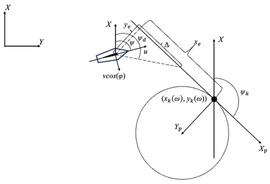 A circular path with radius R was set with the desired position at the centre. When the sailboat reached the circular path, path-tracking control was performed. The line of sight (LOS) navigation method was adopted for the path-tracking process. Given that the position of the sailboat is represented as , the position coordinates of the circular path are represented as , and the circular path is represented by the adjustment parameter ω. By adjusting ω, the LOS algorithm can correct the position of the reference point in real time, so that the current position of the sailboat gradually converges to the desired circular path. Using the LOS navigation method described in [30], the parameterized path of the horizontal plane of the circular path tracking based on the LOS is shown in Figure 3.