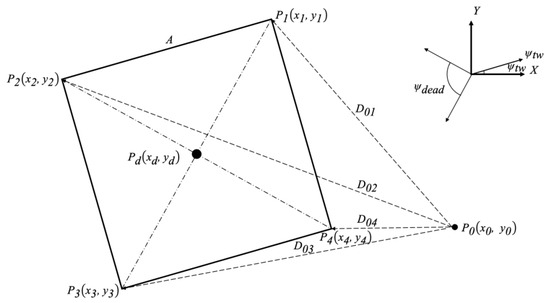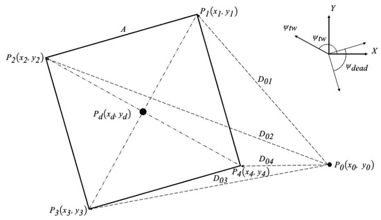 Considering the desired position as the intersection of the diagonals, a square path was designed with an angle between the diagonal and wind direction equal to half the angle of the navigation dead zone. Let the side length of the square be A. The square path was formed by determining the position coordinates of its four vertices, and path tracking was simplified into waypoint tracking by sequentially tracking these vertices. This square path is indicated by the thick solid line in Figure 4.