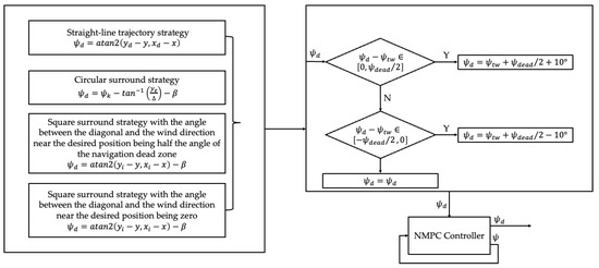 Due to the unmanned sailboat’s control limitations within the navigation dead zone, additional measures were introduced to avoid prolonged entry into this region. Prolonged presence in the dead zone could result in stalling and a loss of maneuverability. The desired heading was adjusted to lie 10° outside of the dead zone boundaries. Specifically, when the angle between the expected heading and the true wind direction was between 0 and , the expected heading was designed to be . When the angle between the expected heading and the true wind direction was between and 0, the expected heading was designed to be , that is