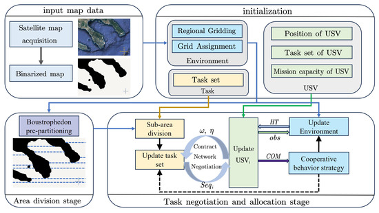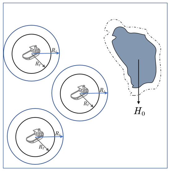 As shown in Figure 3b, USVs have the capability to communicate with each other, but this communication is hindered when obstacles are present between the USVs, as illustrated by the black-dotted arrows in the figure. Conversely, when there are clear communication pathways, denoted by blue arrows in the figure, the USVs can effectively exchange information. This strategic approach serves to minimize the communication overhead between USVs, even if it means navigating longer distances to circumvent obstacles and unnavigable areas. Ultimately, this approach contributes to the reduction of unnecessary coverage path lengths.