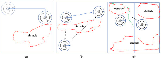 Schematic diagram of the final coverage path of the algorithms; (a) obstacle recognition; (b) distributed communication; and (c) regional transfer.