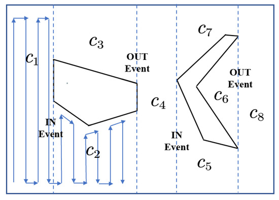 The Boustrophedon cell decomposition [39] used in this paper is an enhancement of the trapezoidal decomposition designed to minimize the amount of redundant longitudinal motion, as described in the previous paragraph. Essentially, all cells between the IN and OUT events are merged into one cell. We compare the graph’s trapezoidal decomposition with the Boustrophedon decomposition. The Boustrophedon decomposition was found to have a low number of unit regions. Rather than exploiting the structure of polygons to determine the IN and OUT events, this approach relies on changes in slice connectivity to determine the presence of events. The schematic diagram of the Boustrophedon algorithm is shown in Figure 4. The blue dotted line represents In Events or Out Events, and the blue solid line represents the path planned within the segmented area.