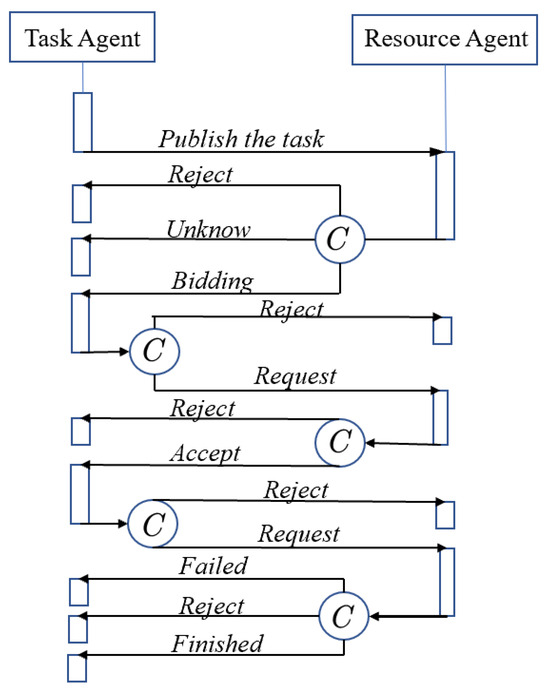 In the contract network model, the task agent is responsible for task decoupling, release, and task coupling. The resource agent is responsible for negotiating sub-tasks to ensure normal task operations. Within this framework, resources maintain a peer-to-peer relationship, acting both as managers and receivers of sub-tasks. The solution to complex tasks is finally realized through direct or indirect interactive communication. The interactive negotiation process within the contract network is shown in Figure 5.
